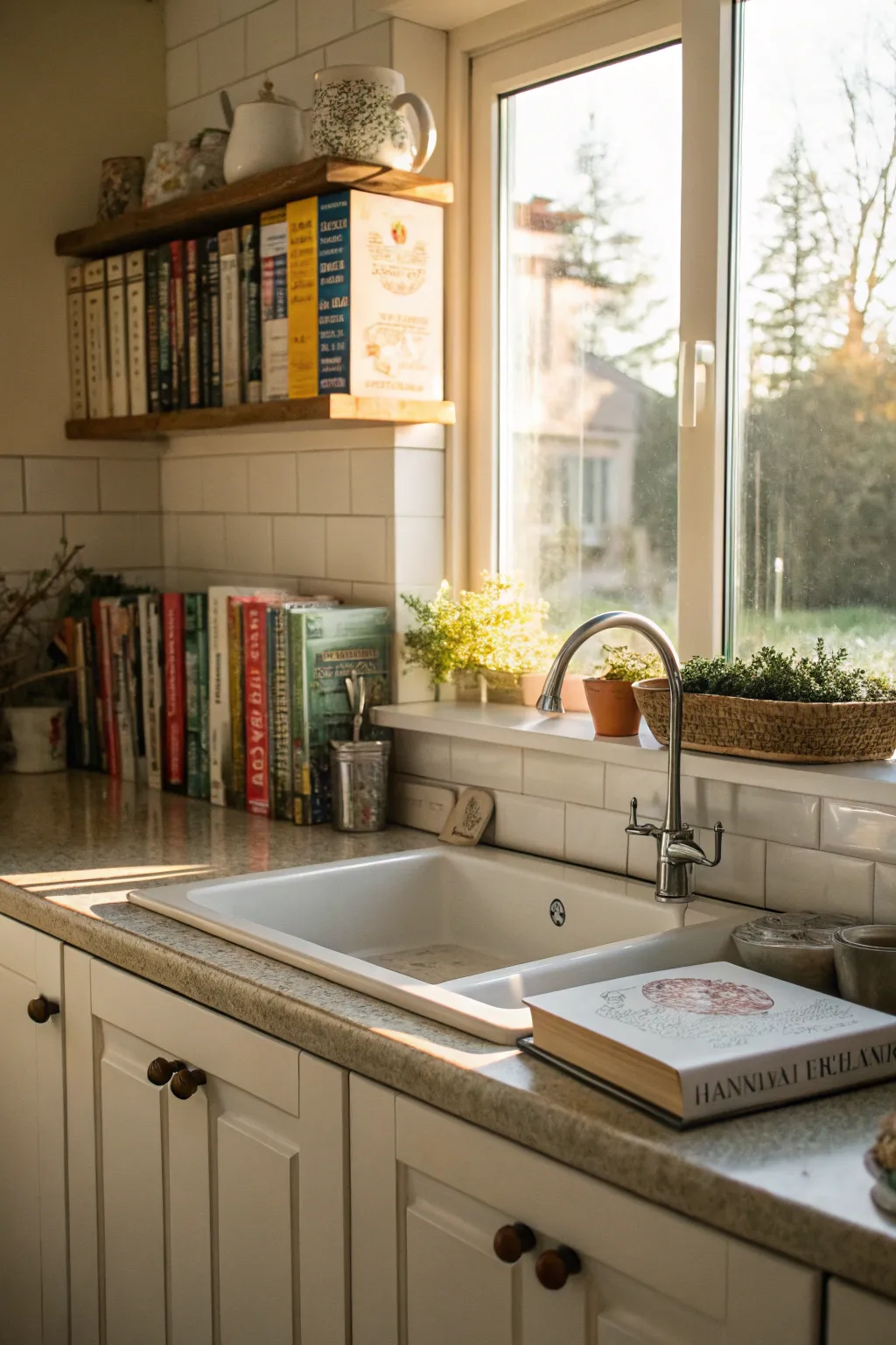 Employ the space over your sink to present a selection of culinary guides for effortless access and motivation. It’s a practical option that I find visually pleasing.