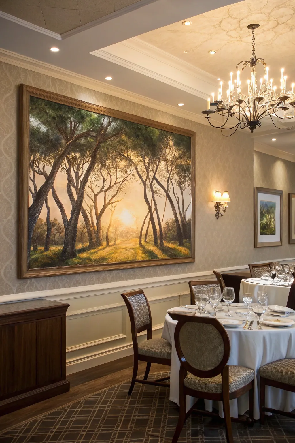 Capture the enchantment of a forest with interpretive depictions of woodlands and sunlight. I once used this notion to create a whimsical piece that became the main attraction of our dining space.