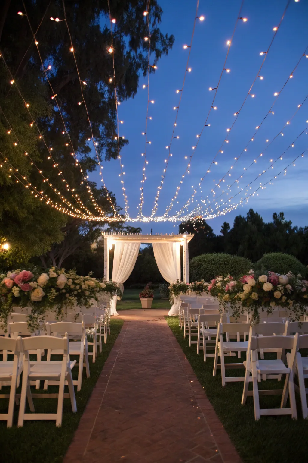 Suspend fairy lights above the aisle to create a magical ambiance. I once helped install this setup at a friend’s wedding, and walking beneath it felt as if you were walking under a star-filled sky.