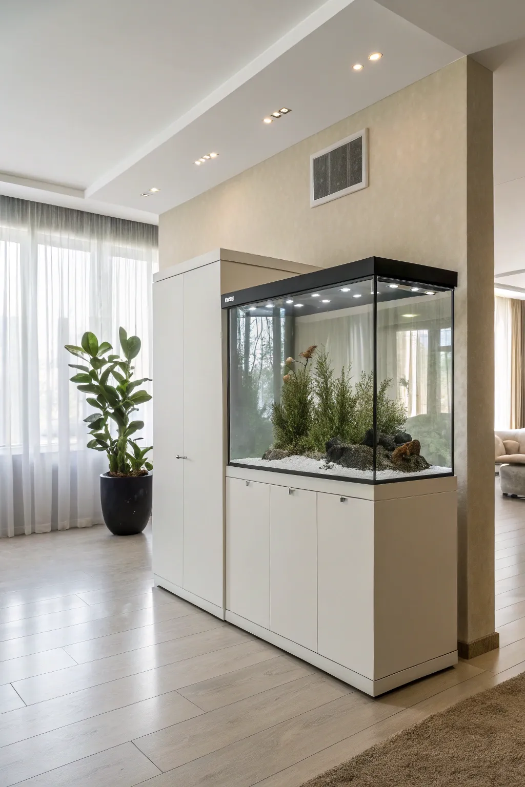 Inventively partition your area with an aquarium dividing feature that also serves as a space divider. Incorporating one into my open-layout apartment elegantly distinguished the dining and lounge zones.