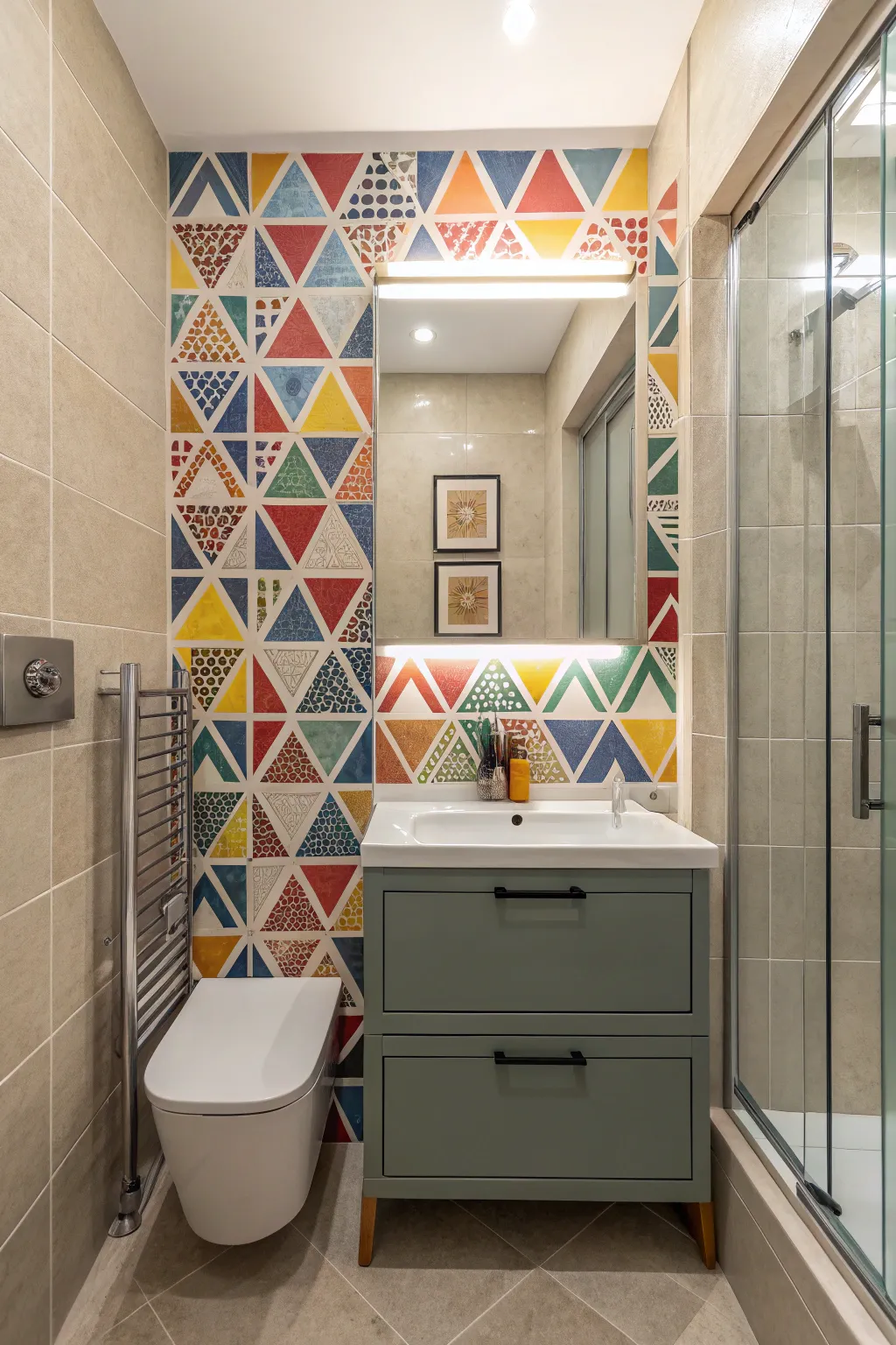 - Geometric Pattern Restroom Cladding: Enhance your bathroom with geometric cladding, crafting an up-to-date and energetic highlight wall.