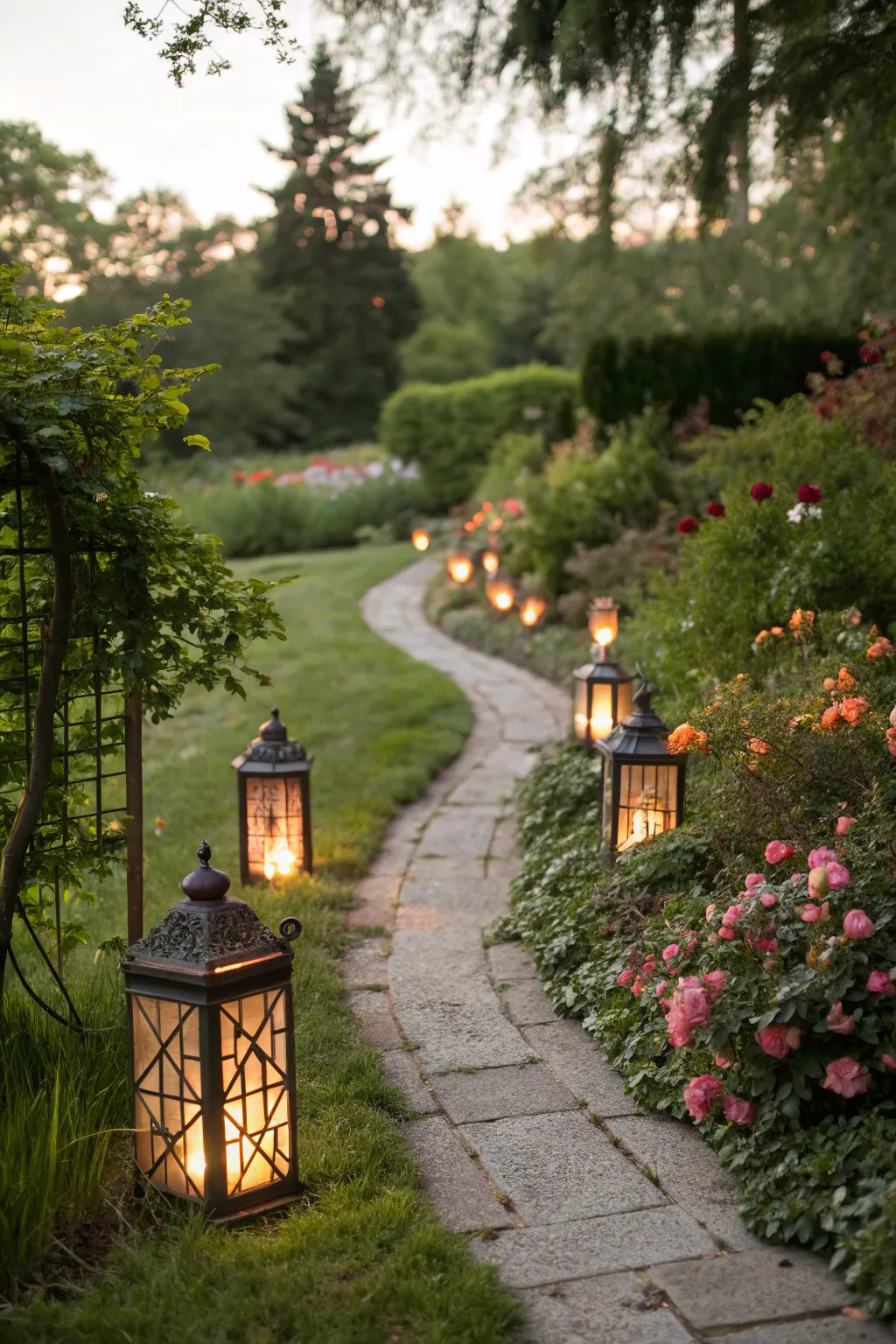 Direct your attendees using lanterns to delineate the route to your garden, delivering both useful lighting and captivating visual appeal. I frequently utilize lanterns to accentuate my garden’s innate walkways, introducing an alluring luminosity.