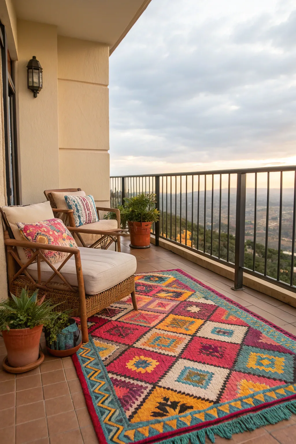 - Free-Spirited Balcony Rug: Introduce a touch of free-spirited flair with this rug. Design an inviting outdoor living space.