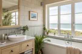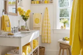 - Layer in bright whites with towels and ceramics, keeping the palette soft and uplifting.