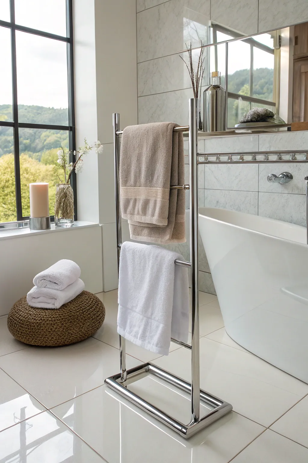 - Chrome Freestanding Rack: Elevate your bathroom’s look with this chrome stand. Great for any space.