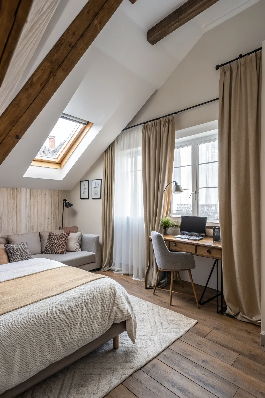 Use curtains to create privacy or separate areas within your loft bedroom. They act like gentle barriers, flexible and stylish.