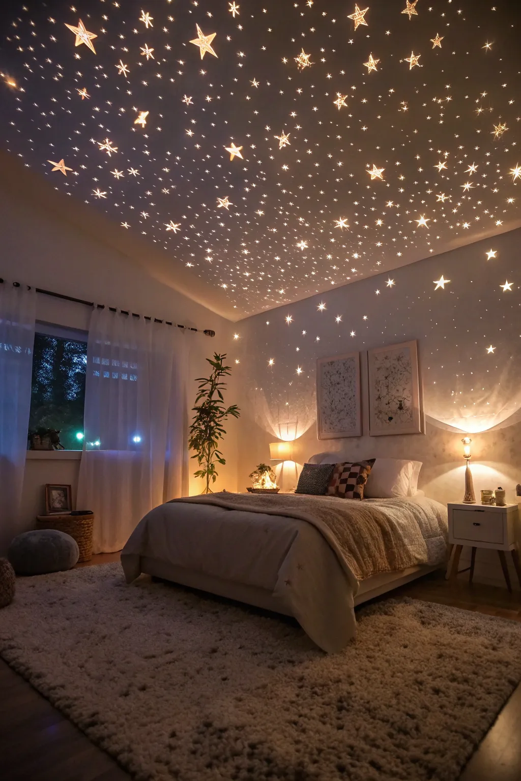 A ceiling covered with shimmering stars or a celestial painting can magically transform any room into a cosmic paradise. From what I’ve noticed, using a blend of stick-on stars and LED lights creates a truly enchanting nighttime ambiance.