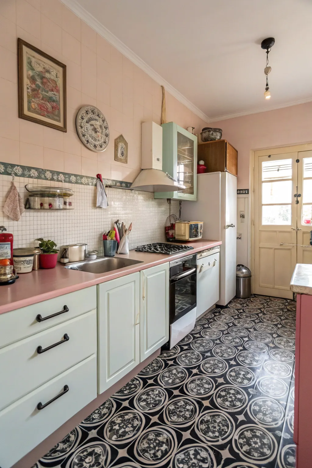 - Retro Kitchen Wall Ornamentation: Enhance your retro kitchen with charming, retro wall ornamentation to complement the classic floor pattern.