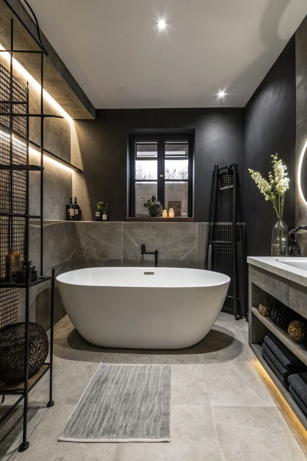 - Bohemian-Style Bath Textile: Add surface quality and warmth with a bohemian-style textile that complements the dark and grey scheme.
