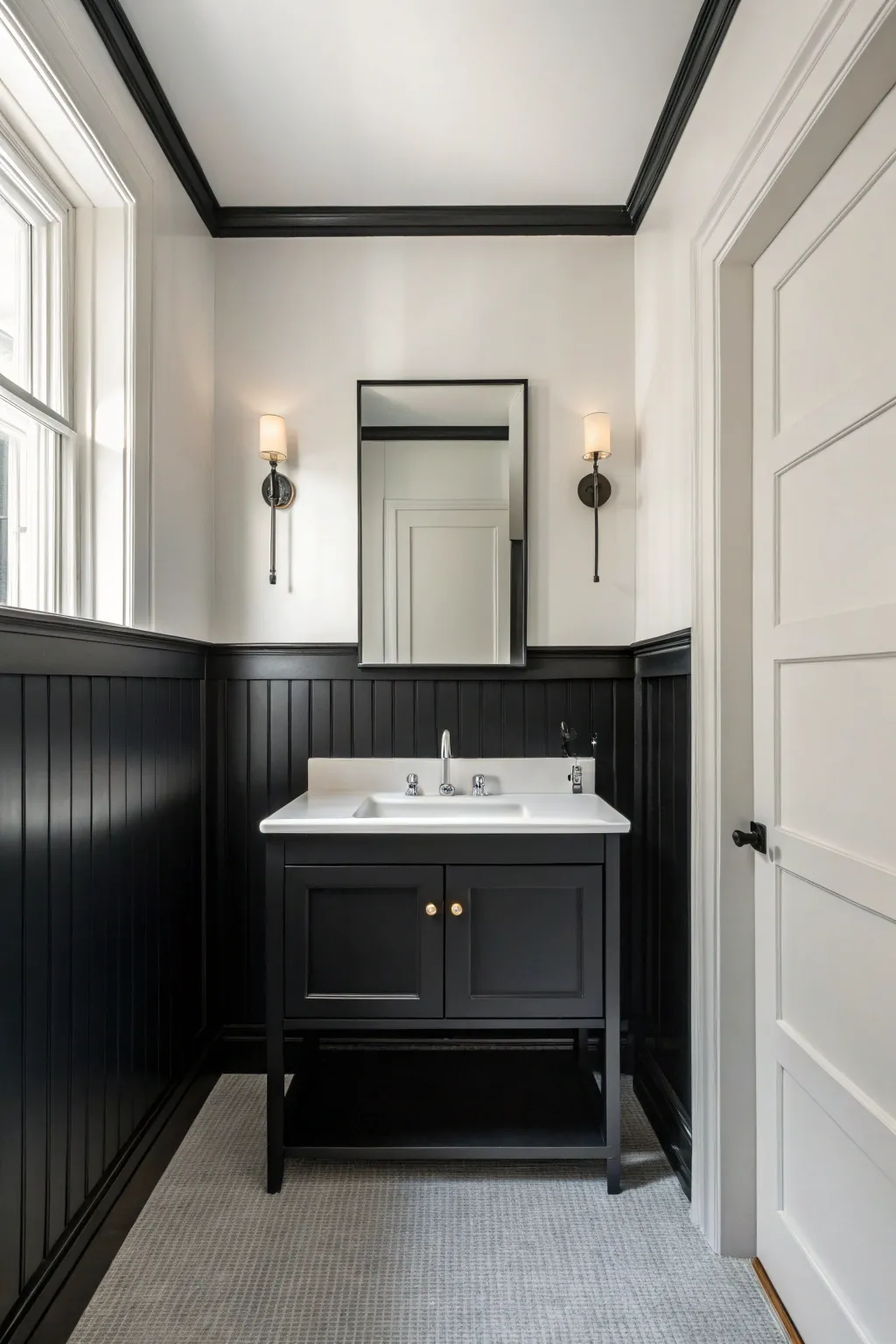 Achieve a minimalist design in your bathroom with black paneling against bright white walls. This simple choice exudes modern elegance with ease.