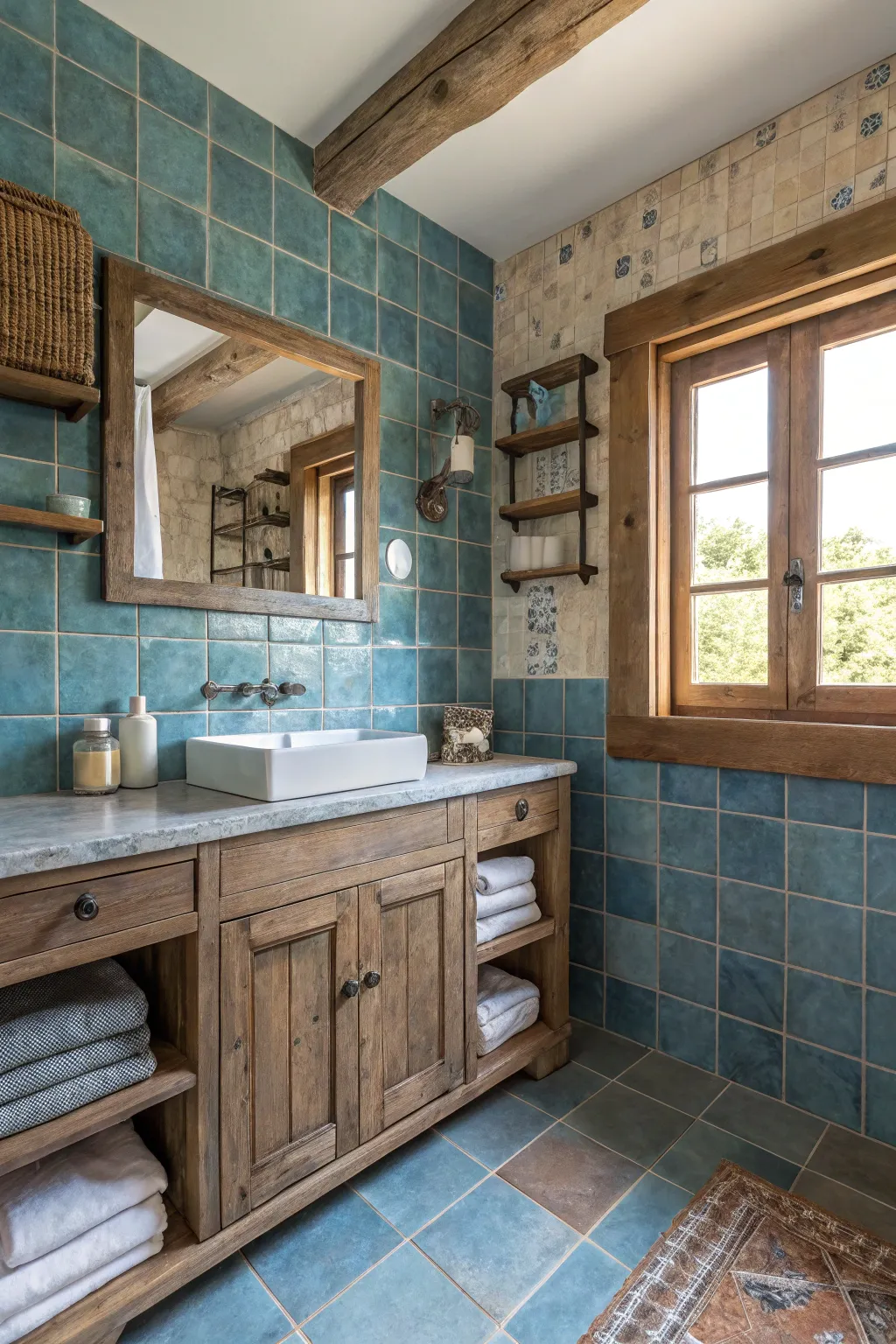 - Wood Bathroom Sink Combo: Incorporate a wood sink combo to go with azure ceramic for a cozy, rustic atmosphere.