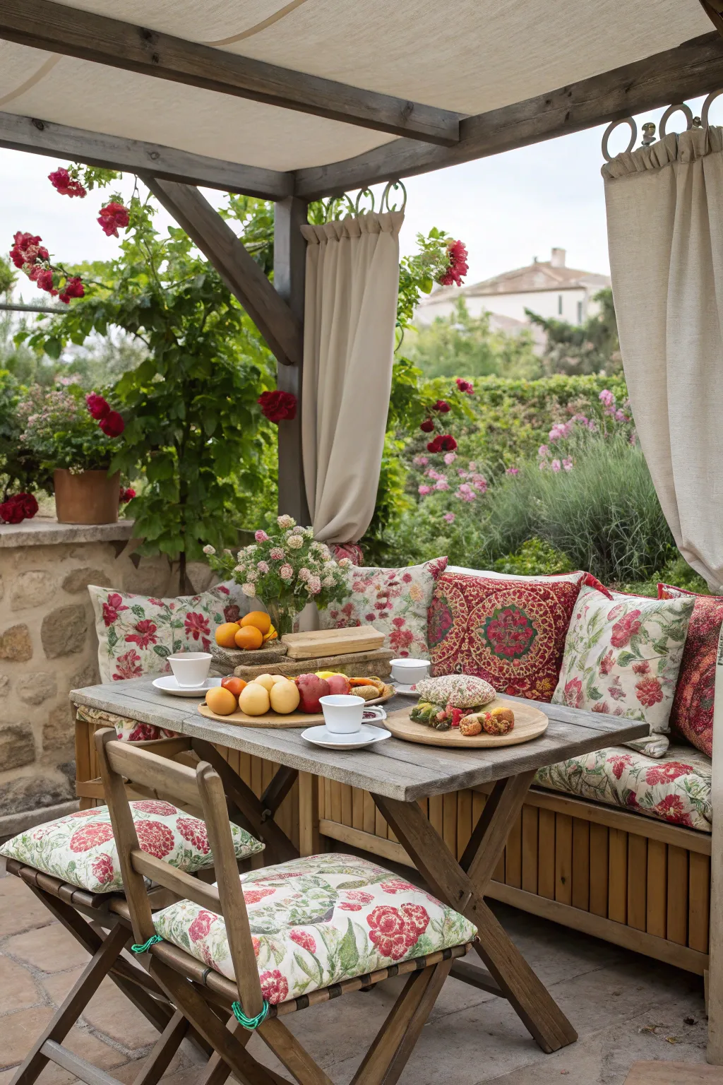 Select country-style furnishings like time-worn wood or ornate ironwork to give your nook character. I discovered that an antique wooden table paired with uniquely matched chairs provided a lovely, old-fashioned vibe to my outdoor area.