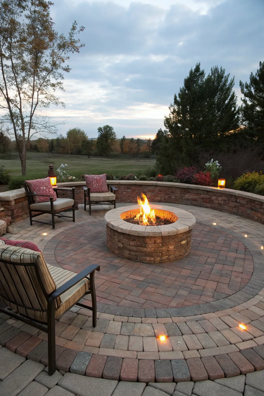 Design a circular blockwork area encompassing a bonfire pit for cozy gatherings. I adore how it organically becomes the heart of social events, inviting warmth and conversation.