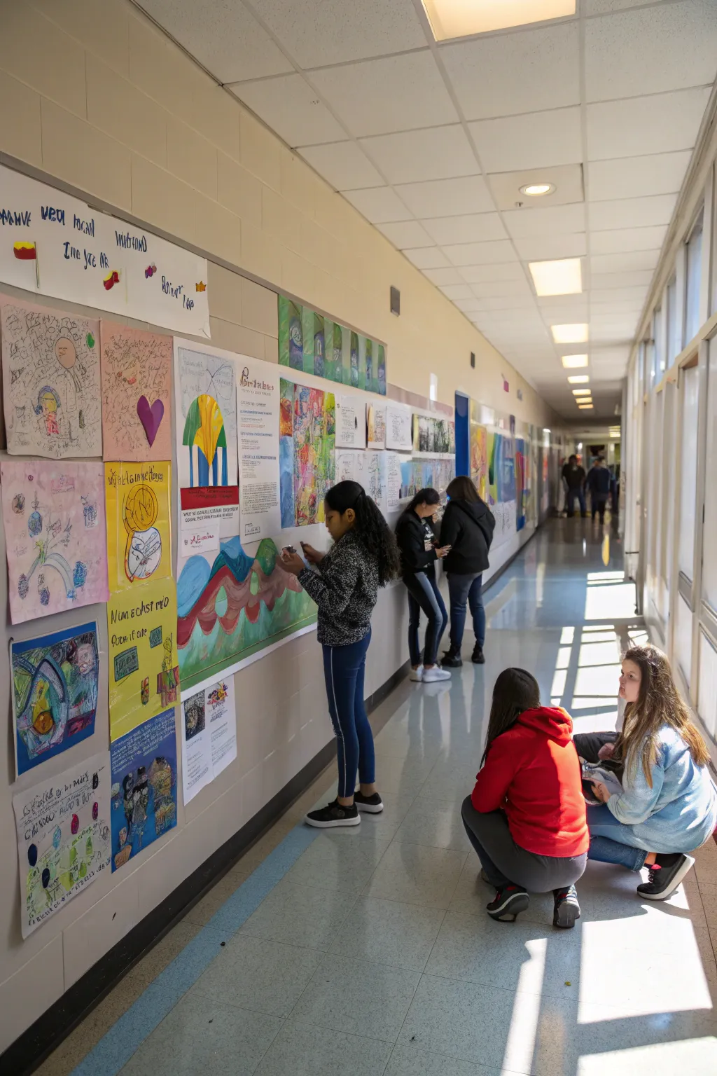 A collaborative mural project on a bulletin board in a school hallway.
