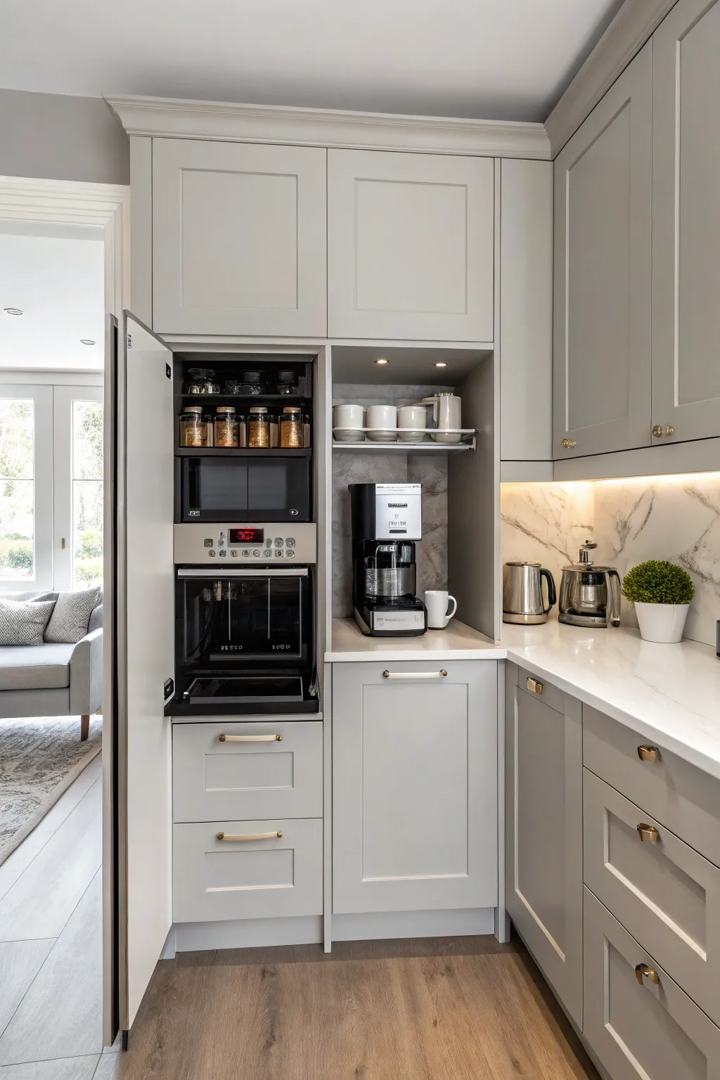 Think about custom-made cabinets to neatly organize your coffee maker and supplies. This not only keeps things looking tidy but also makes the area perfect for your specific needs—a detail I always include in luxury designs.