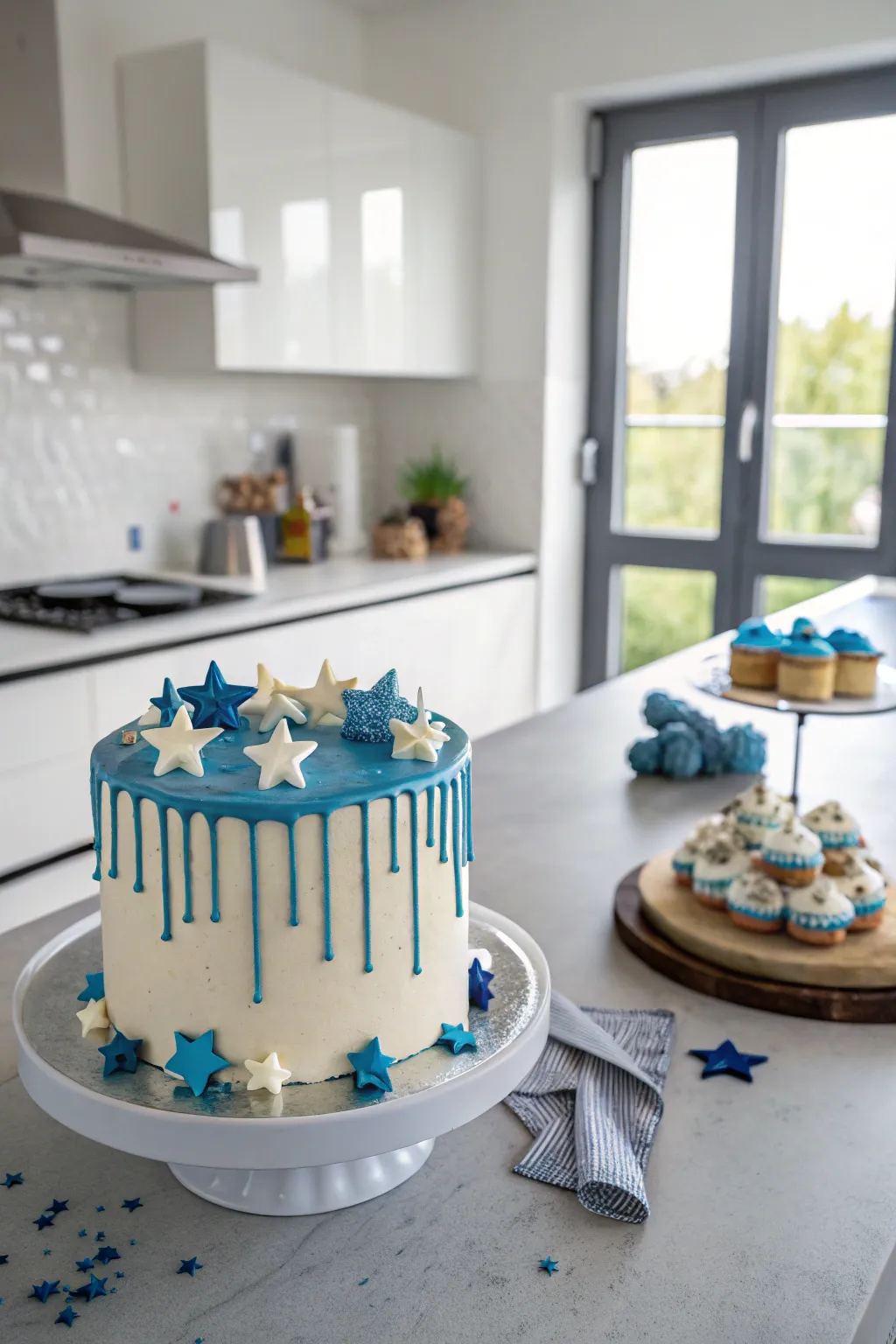 For a fashionable appearance, choose a dripping glaze style. Employ azure confectioner’s coating for the drip effect, and sprinkle edible stars for a magical touch.