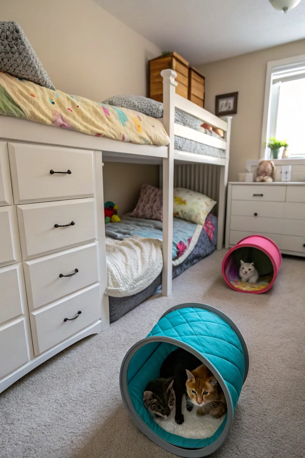 A hidden gem for cat beds or tunnels can be under-bed storage. It’s an ingenious way to make good use of space, keeping your cat comfortable and your room tidy.