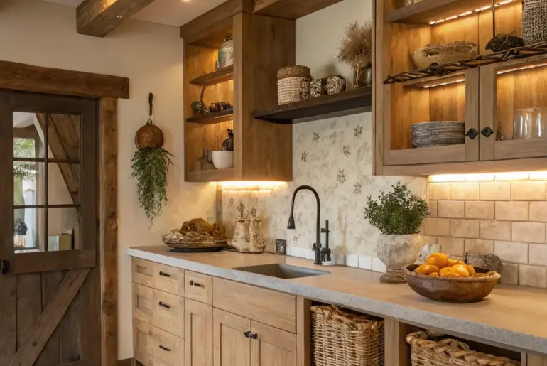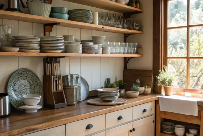 Designing a warm, inviting, and practical rustic farmhouse kitchen in a limited space involves carefully combining elements of comfort, charm, and utility. Let’s discover some appealing ideas that can transform your small kitchen into the heart of your home. Integrate Open Storage Open storage adds personality and functionality to a compact kitchen. Swapping out upper cabinets for open shelves can free up space and beautifully display your favorite kitchenware. I appreciate the blend of practicality…