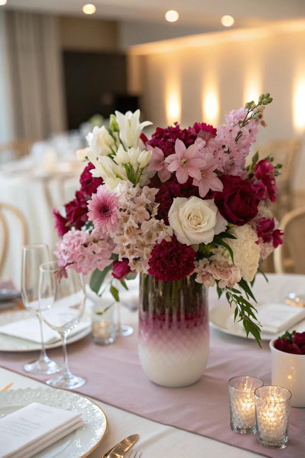 Arrange flowers in a gradient, shifting from deep pink to white, for a striking visual effect. It’s a showstopper sure to spark conversation.