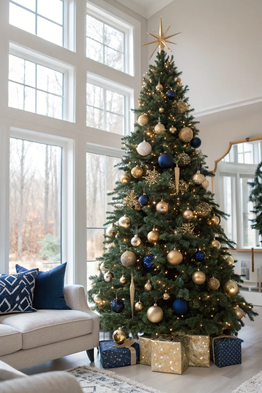 Impart sophistication with navy azure and champagne aureate. This refined palette introduces a modern take to traditional Christmas decor, perfect for a stylish celebration.