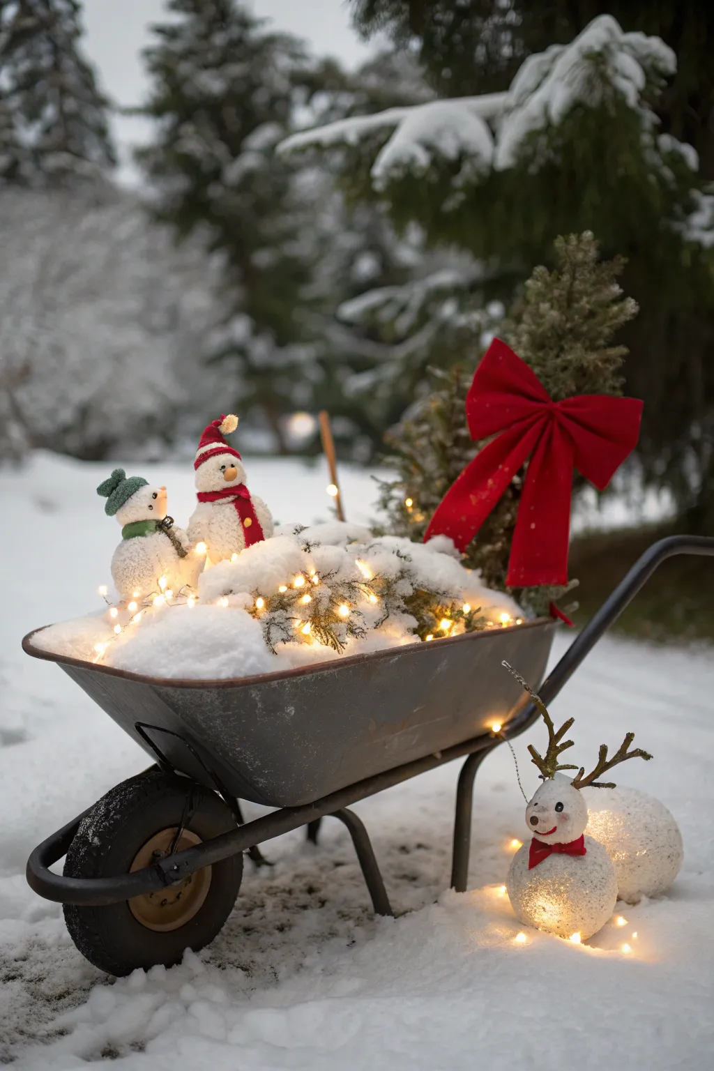 Place a small Christmas tree in your wheelbarrow and decorate it with miniature decorations. This unusual concept is ideal for adding a festive touch to any outdoor setting.