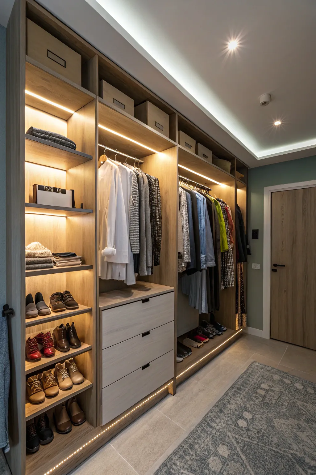 • Smart LED Strips: Enhance your closet’s ambiance through adjustable LED strips to suit every mood.