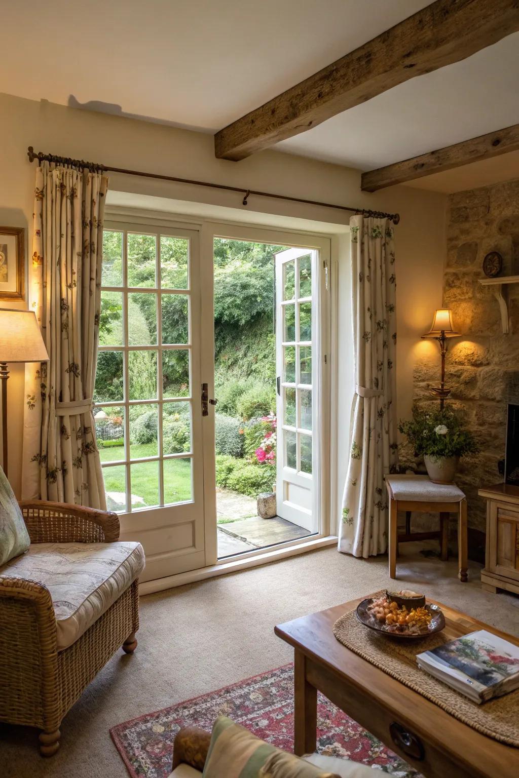 French doors enhance the airy feel of this cottage living room.