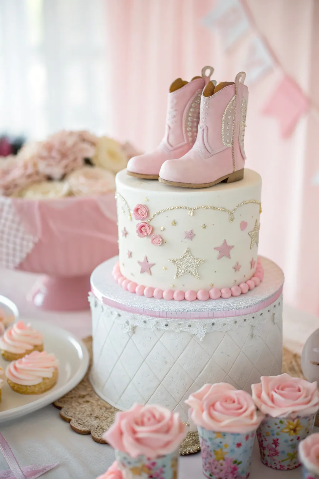 Adorn your cake with lovely fondant cowgirl boots to create an enjoyable and thematic feeling. I’ve witnessed this with a simple vanilla cake, and it invariably makes an impact!