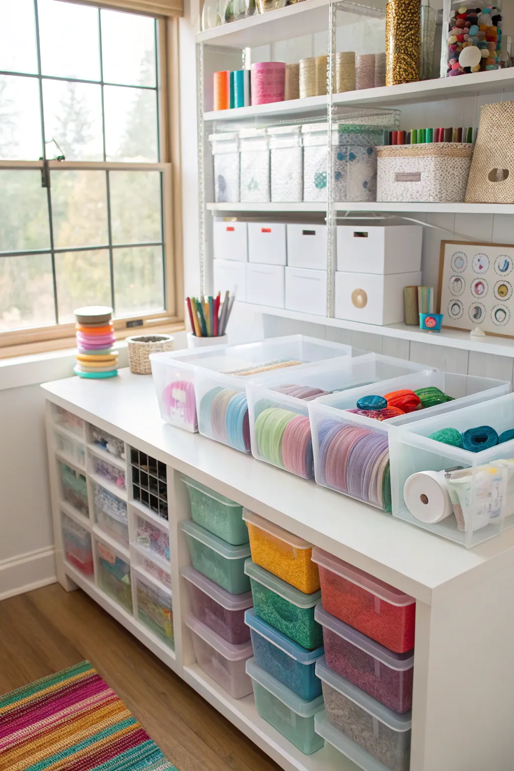 - Stackable Craft Shelves: Brighten up your area with shelves that allow you to easily manage your supplies by color.