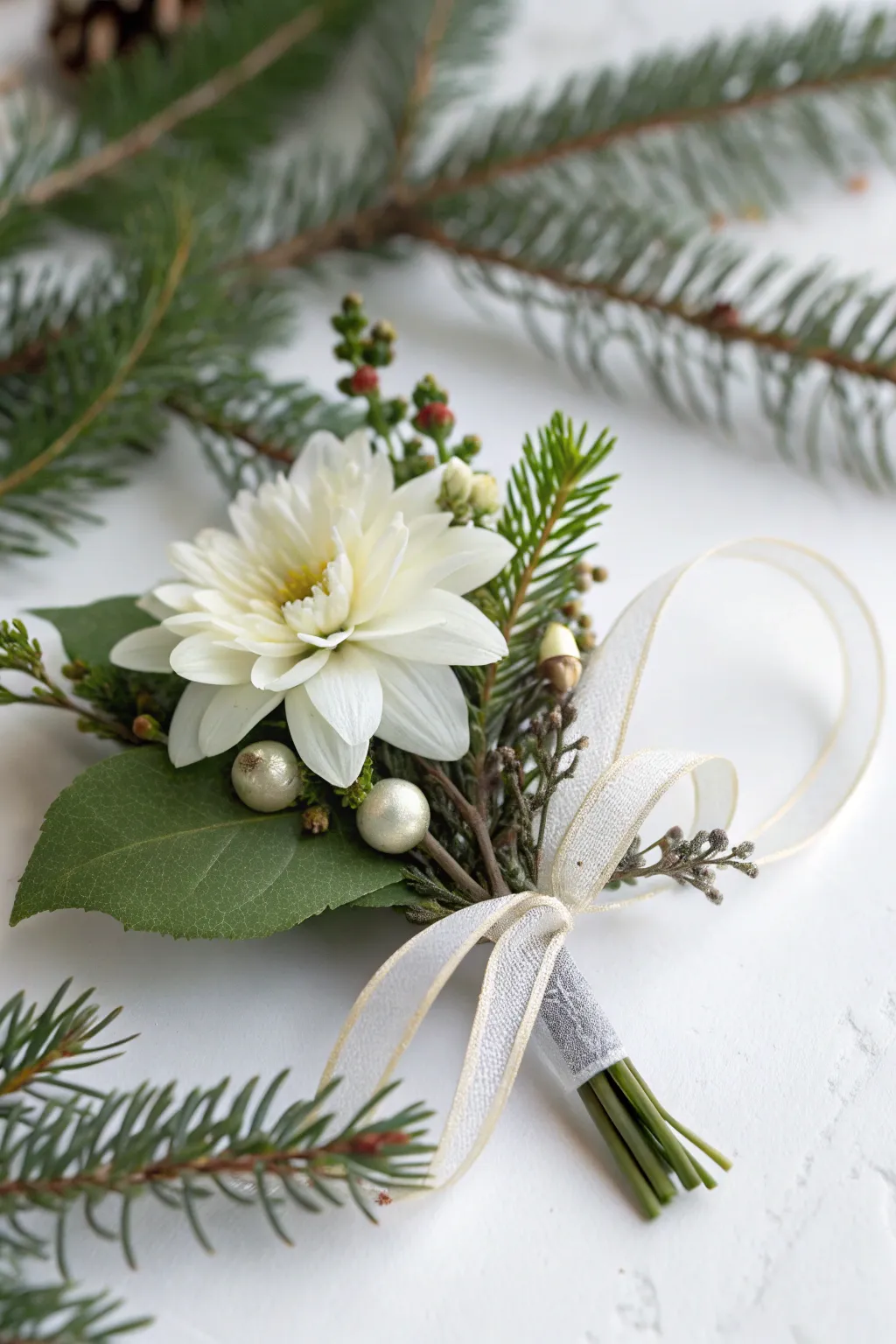 A chic, minimalist Christmas corsage exhibiting a pristine blossom.