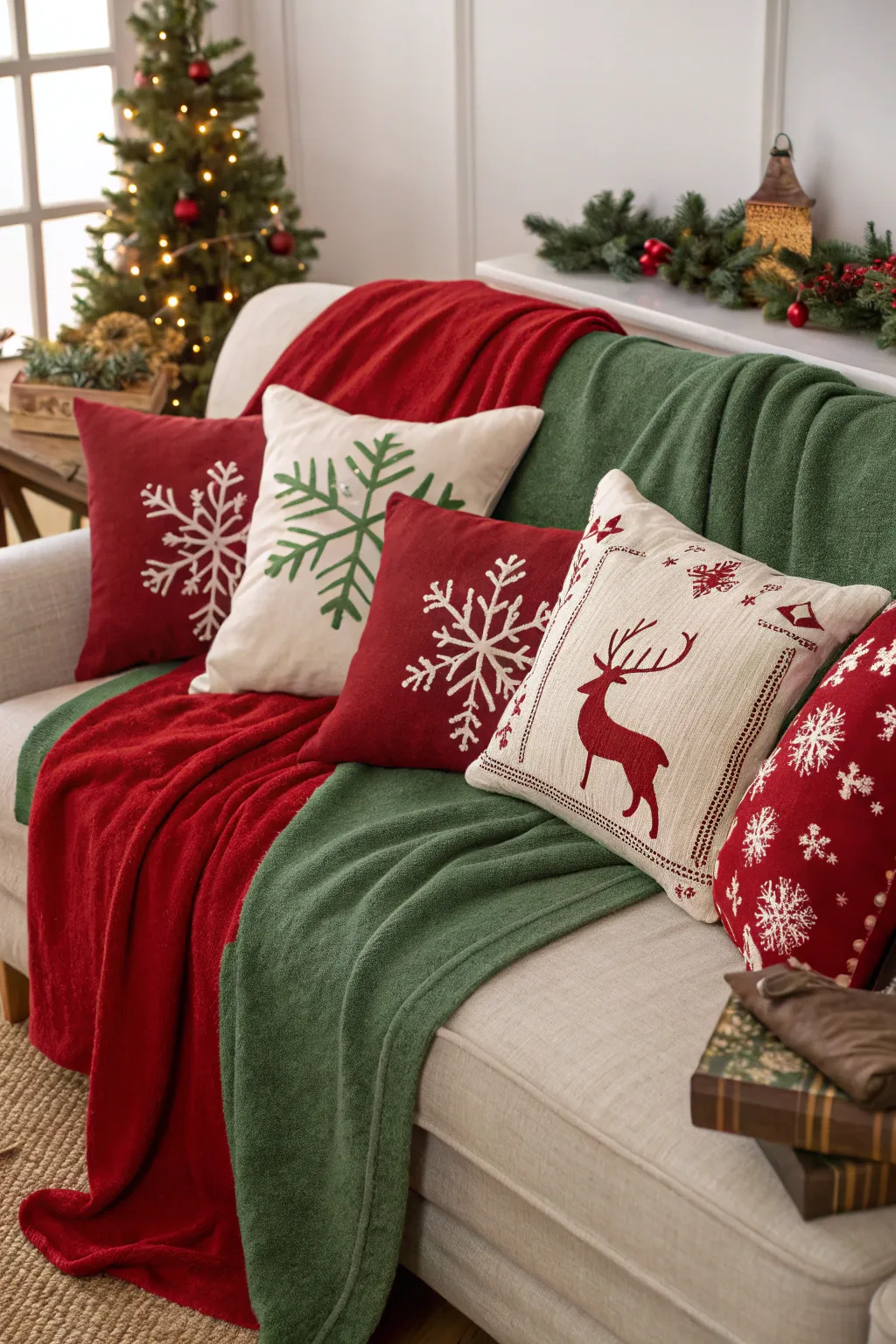 Comfy throws and cushions adding holiday warmth to living spaces.