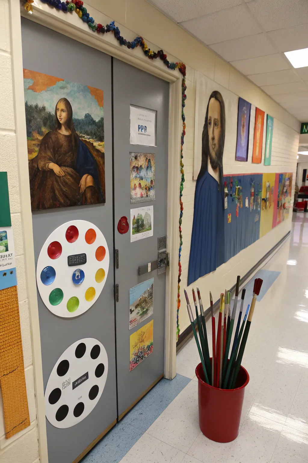 Create an artistic studio using bright palettes, paint applicators, and well-known artwork duplicates. This door frequently turns into a creative center for future artists in my classroom.
