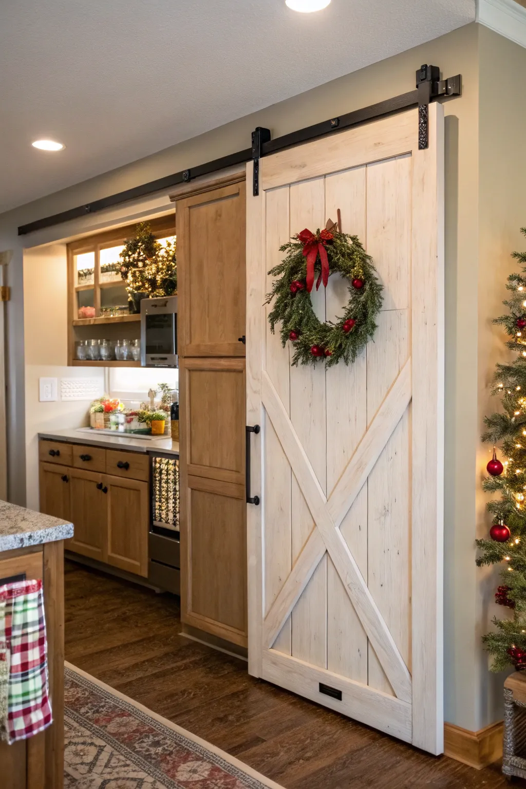 A kitchen featuring a sliding barn door pantry decorated with a seasonal garland.