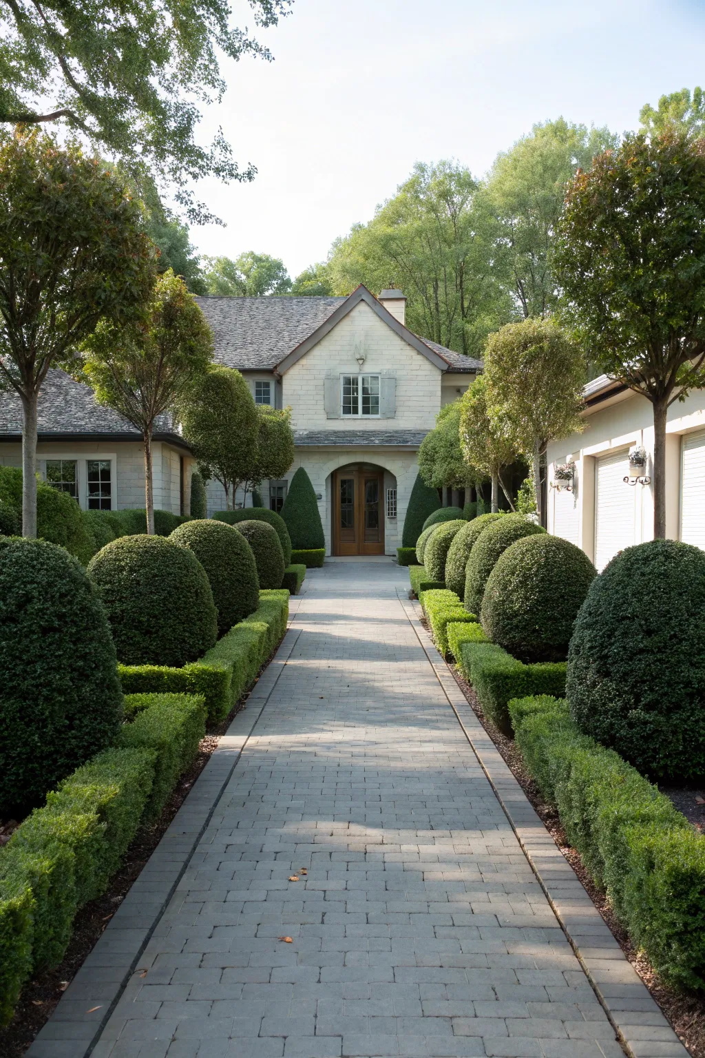 Think about growing orderly bushes to bring in dimension and feel, which softens the driveway’s sharp lines. I frequently implement evergreens in my creations for their continuous beauty.