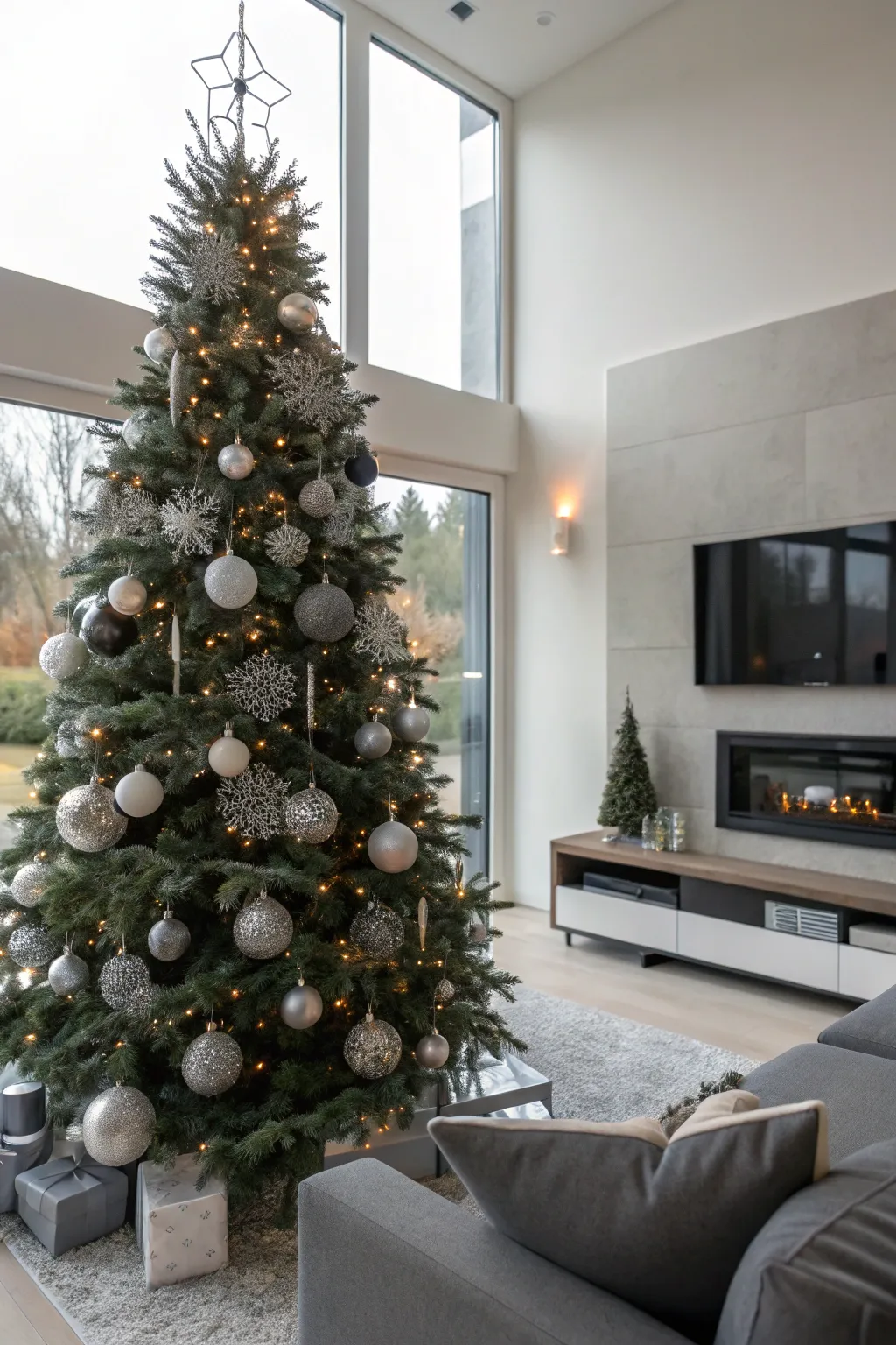 • Silver and Gray Christmas Tree Baubles: Enhance your contemporary tree with elegant silver and gray baubles for a timeless holiday aesthetic.