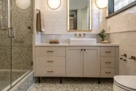 - Rustic Farmhouse Bathroom Light Fixture: Add a warm glow with a rustic light fixture that complements shaker cabinets; enhance ambiance.
