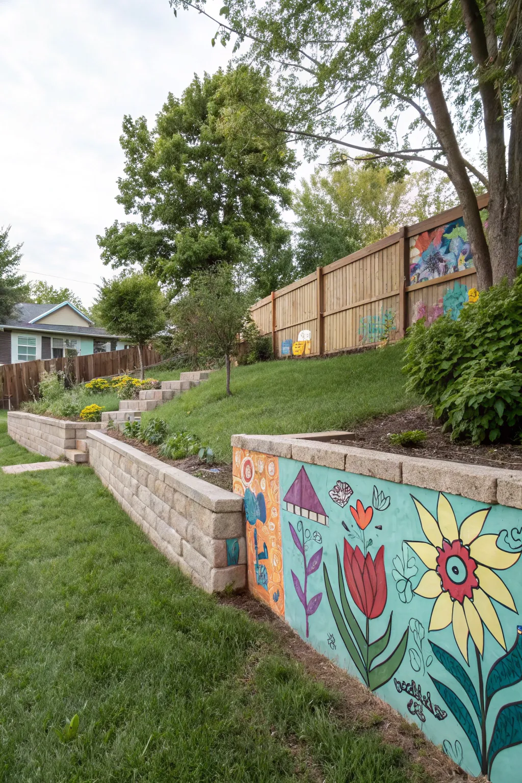 A backyard retaining wall turned into a vibrant wall art.