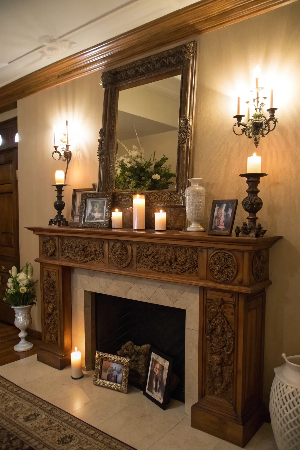 - Elaborate Framed Mirror: Round out your mantel with an amazing center mirror for amplified depth and sophistication.