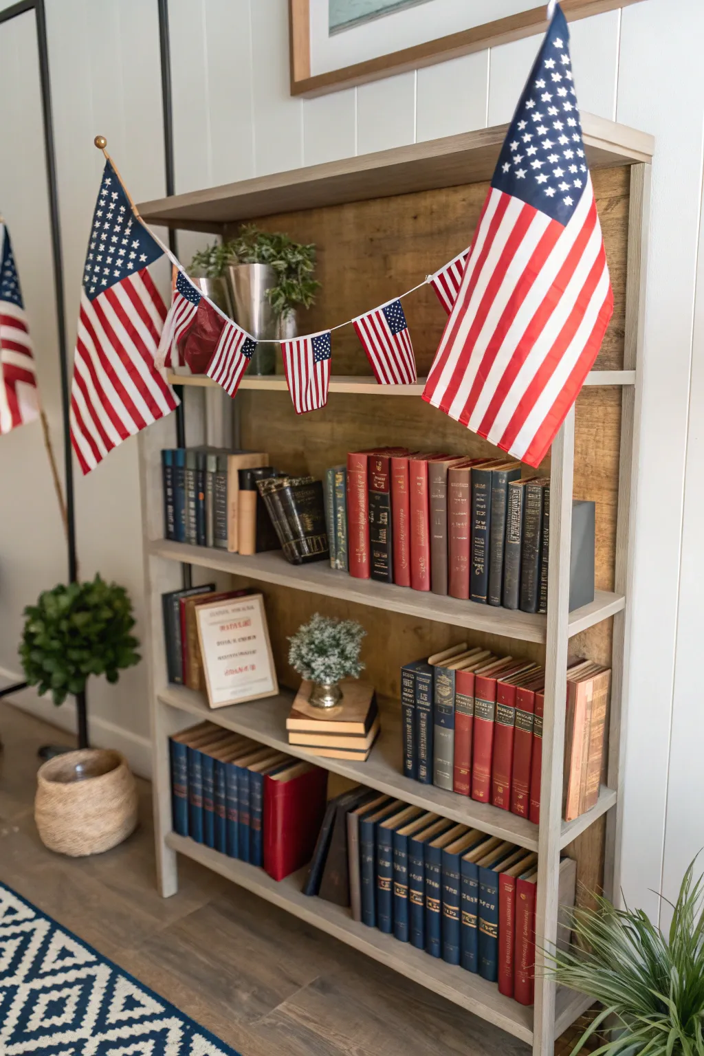 - American Pride Chain: To add vibrant, patriotic flair to your bookshelf display, decorate with a flag garland.