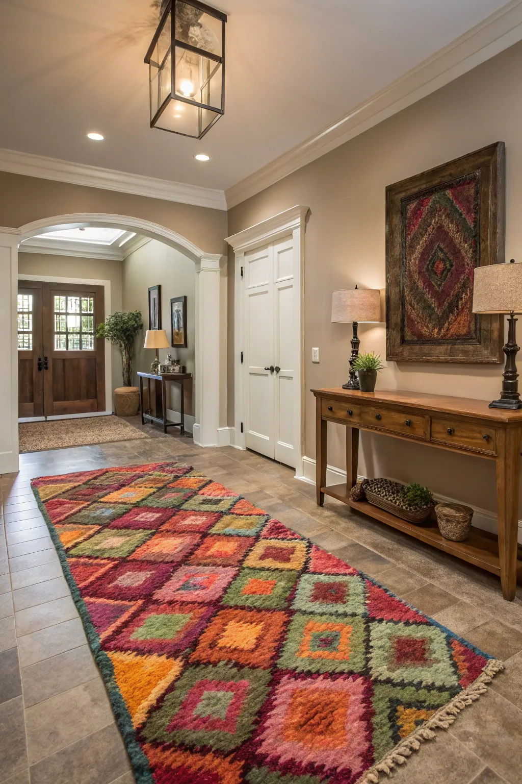 - Colorful Kilim Runner: Elevate your entrance with a colorful kilim runner, establishing a cozy and welcoming atmosphere.