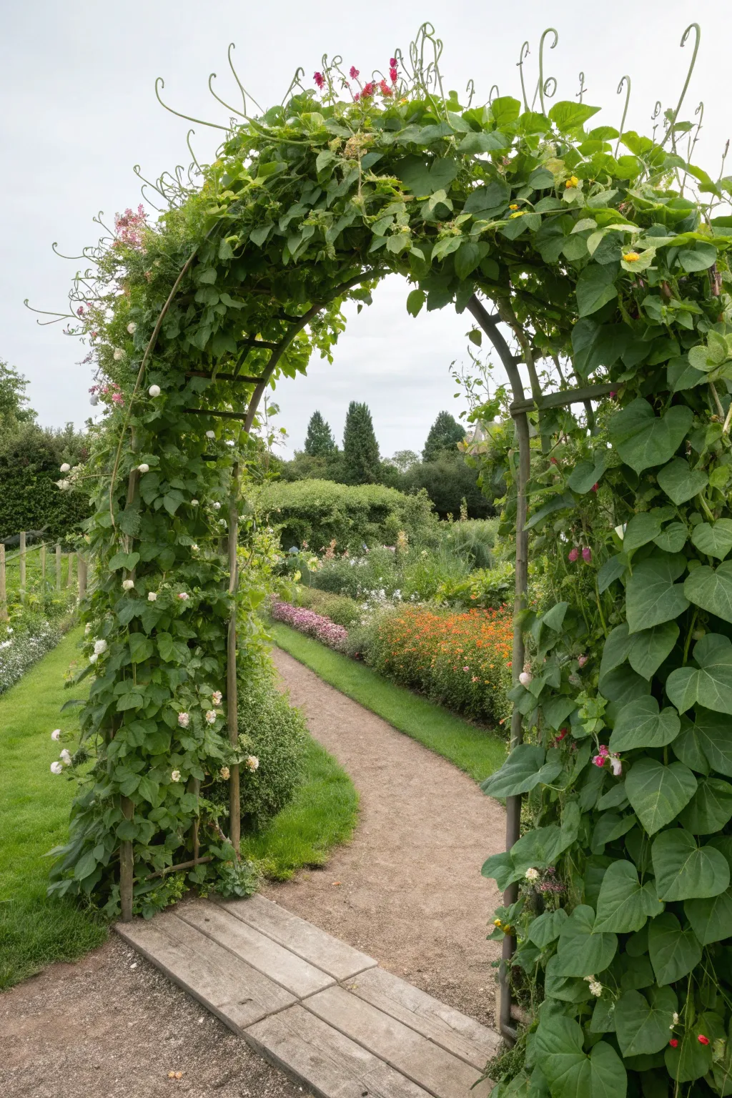 An elevated arched trellis altered my garden path into a lush, verdant refuge. It embodies a charming avenue for cultivating cucumbers and squashes, facilitating seamless harvesting of the pendant fruits.
