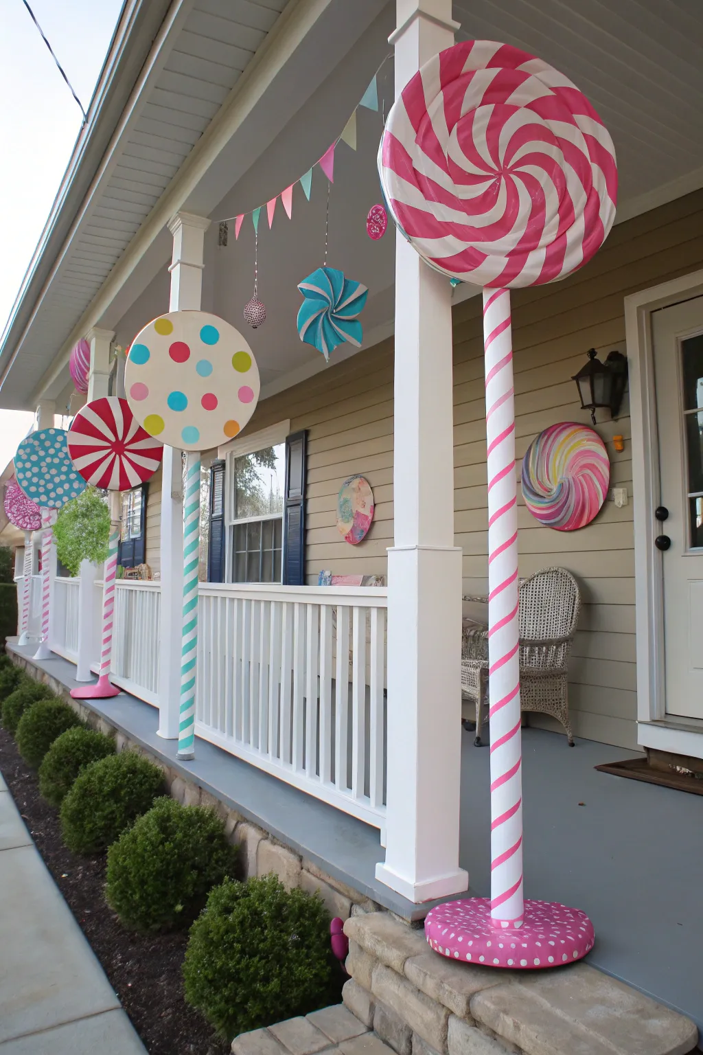 Employ painted polyvinyl chloride conduits and paper circles to fashion oversized lollies for your veranda. These cheerful columns are a delightful surprise—I fashioned them last winter, and they were a significant hit!