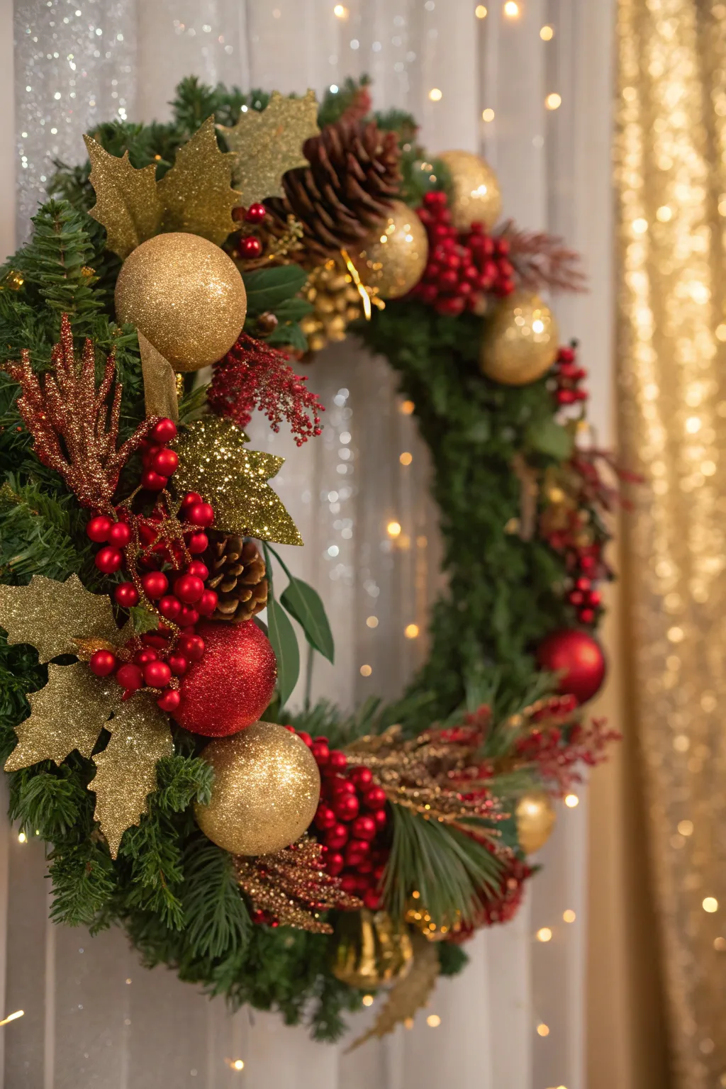 Indulge in all facets of shimmer through a wreath bedecked in gilded sparkles and a scattering of scarlet highlights. This design is destined to captivate and enchant all who behold it.