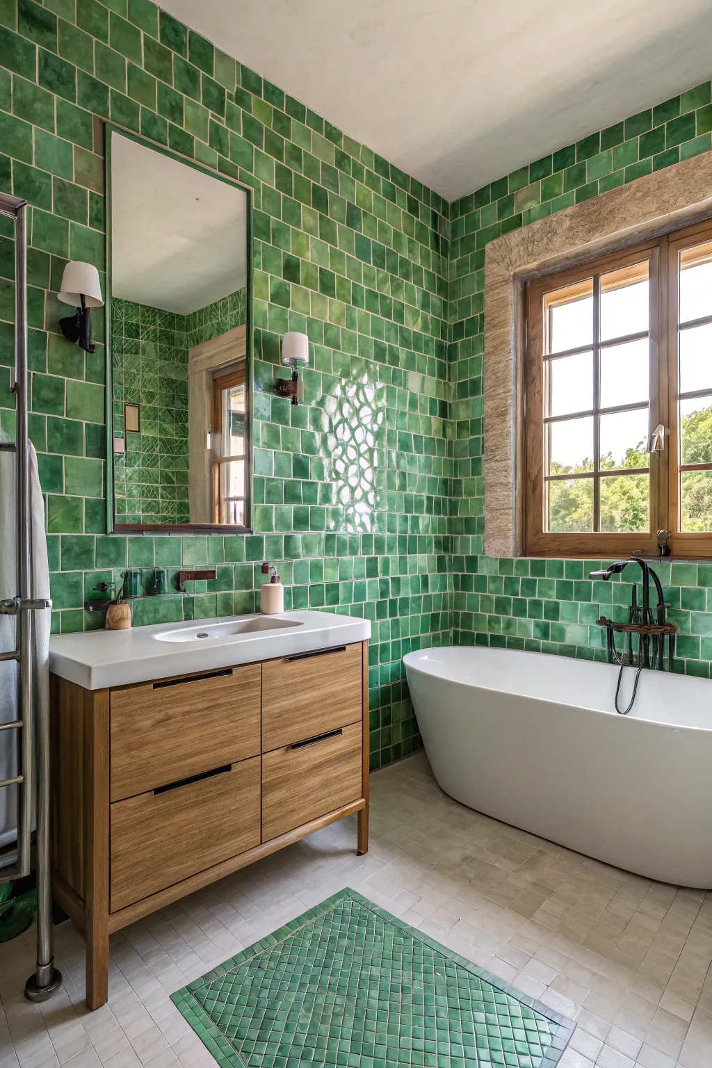 Pairing green tiles with stone has the ability to produce a high-end, luxurious atmosphere in your bathroom. This integration is an automatic choice for those aiming for an element of glamour.