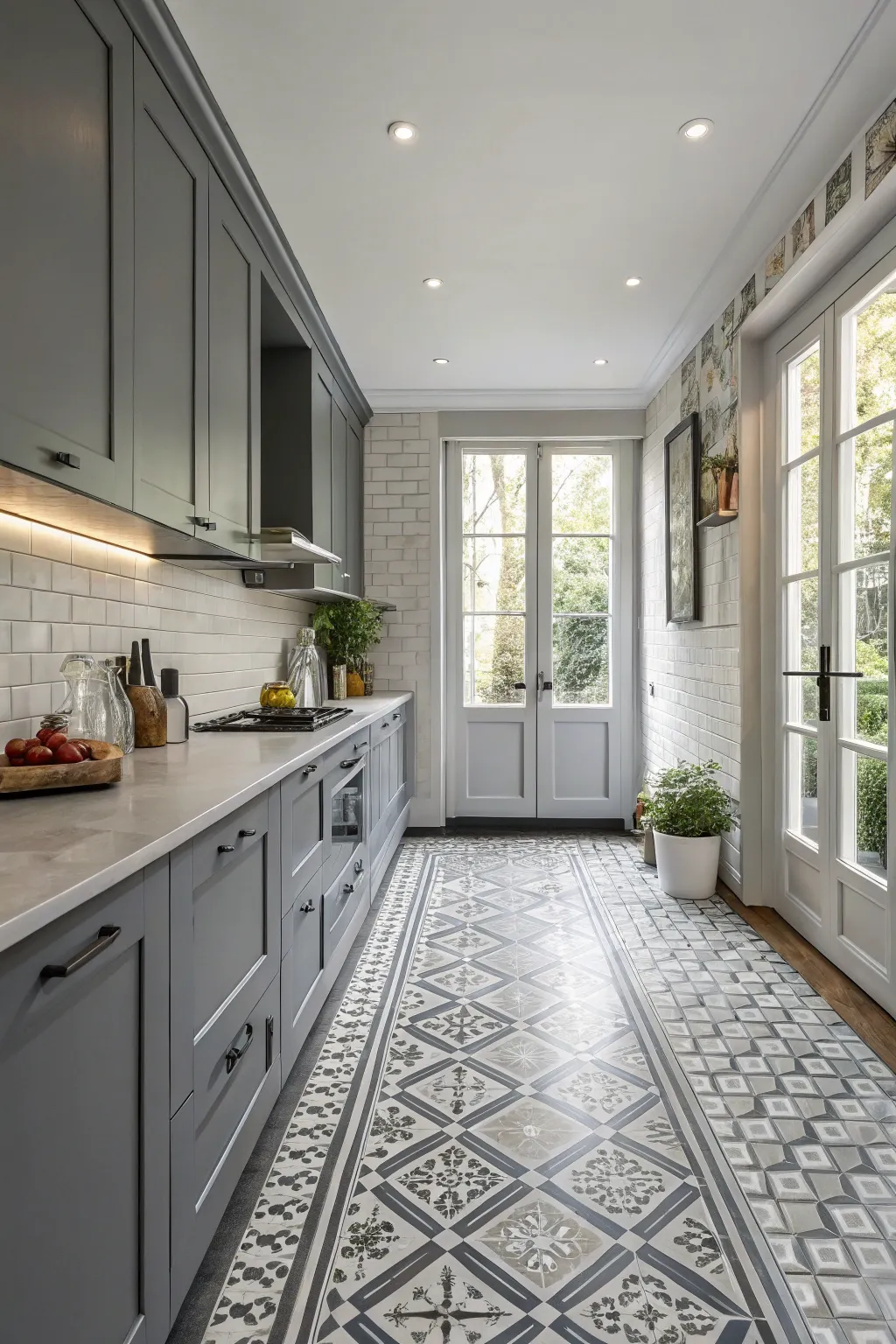 Incorporating shaped designs within tiling or ground treatments can introduce an unanticipated twist to a grey kitchen. It’s a spirited detail that imparts a sense of playfulness and inventiveness.