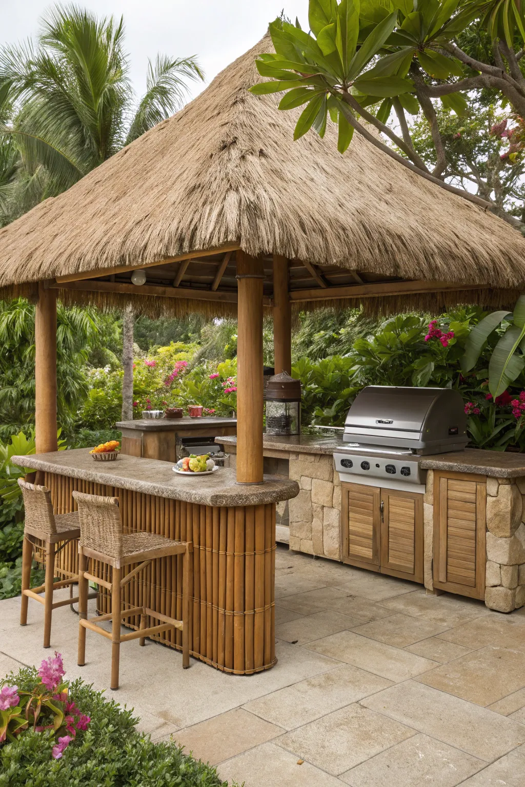 • Exotic Bamboo Bar Set: Enhance your Tiki vibe with a bamboo bar set, perfect for entertaining guests outdoors.