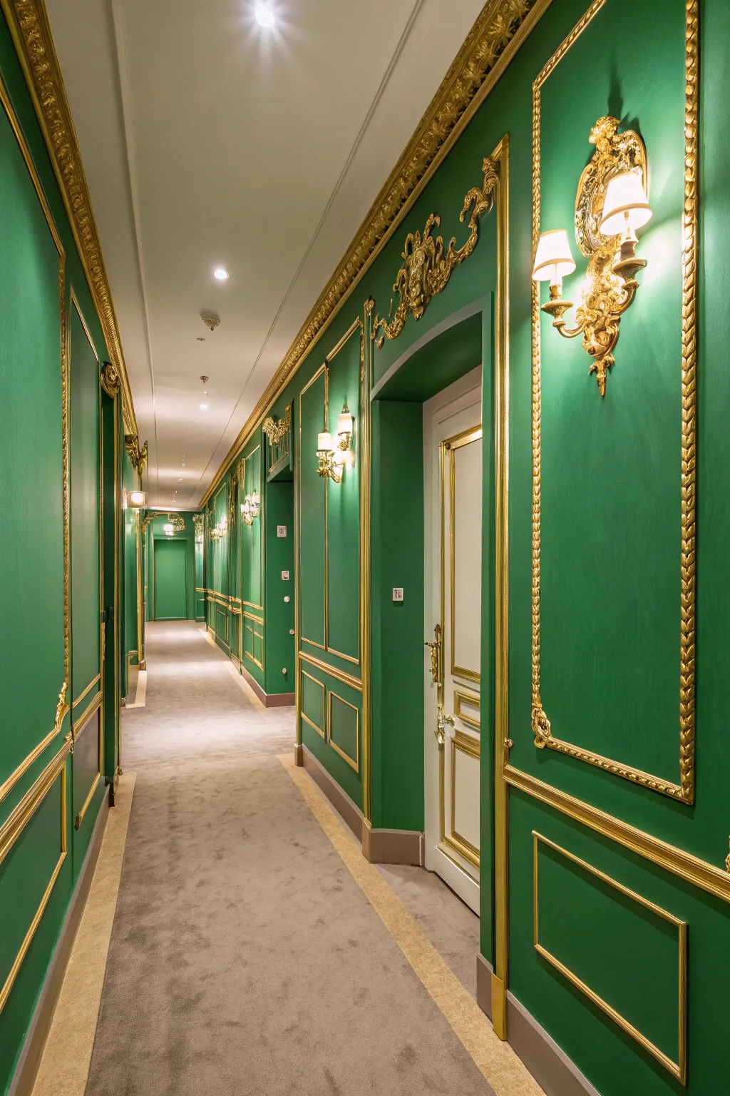 Green and gold accents create a luxurious feel in this hallway.