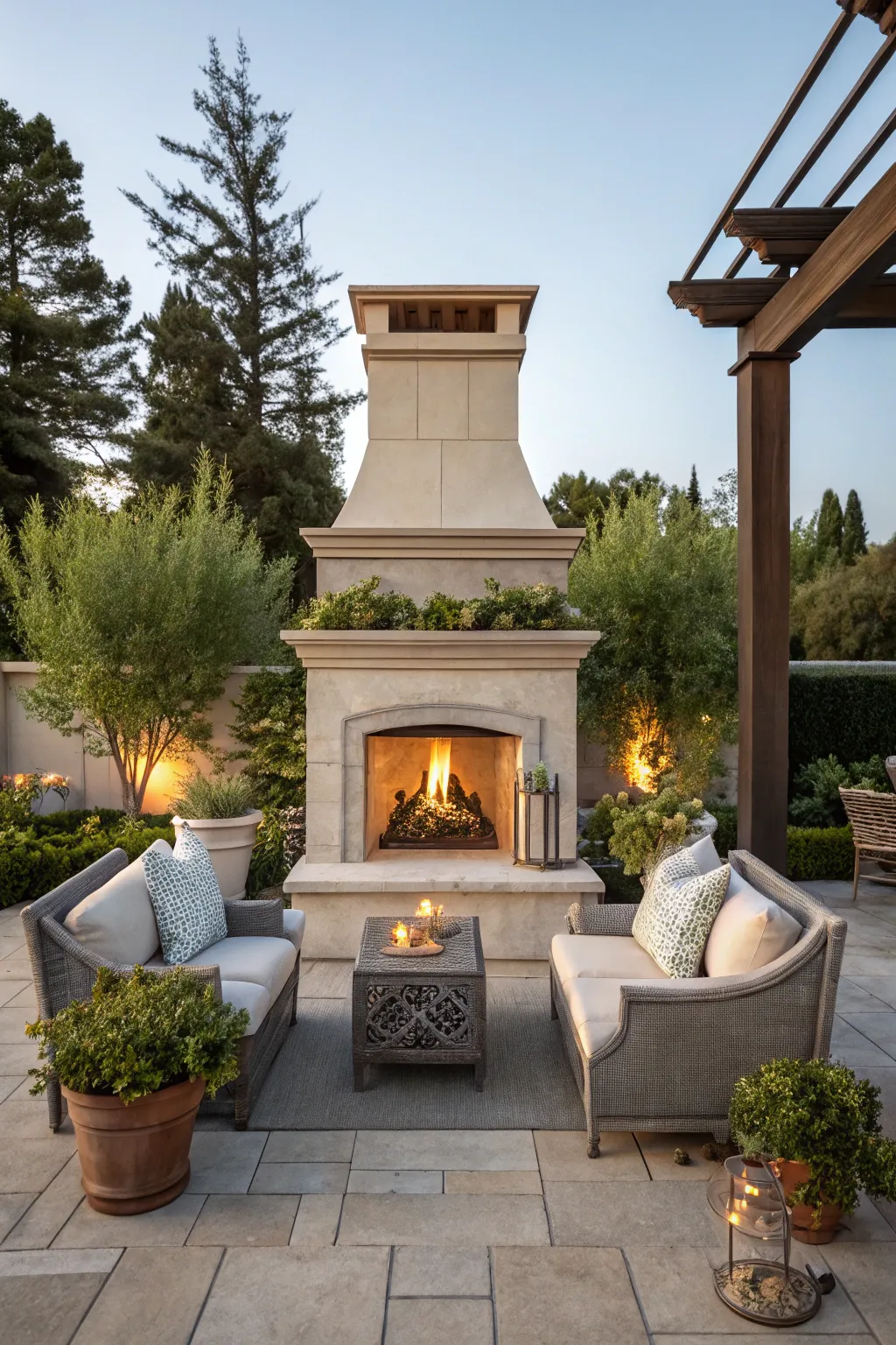 A pergola adorning your fireplace can afford concealment and structure, rendering it a year-round refuge. Mine is swathed in ascending botanicals conducive to heightened charm.