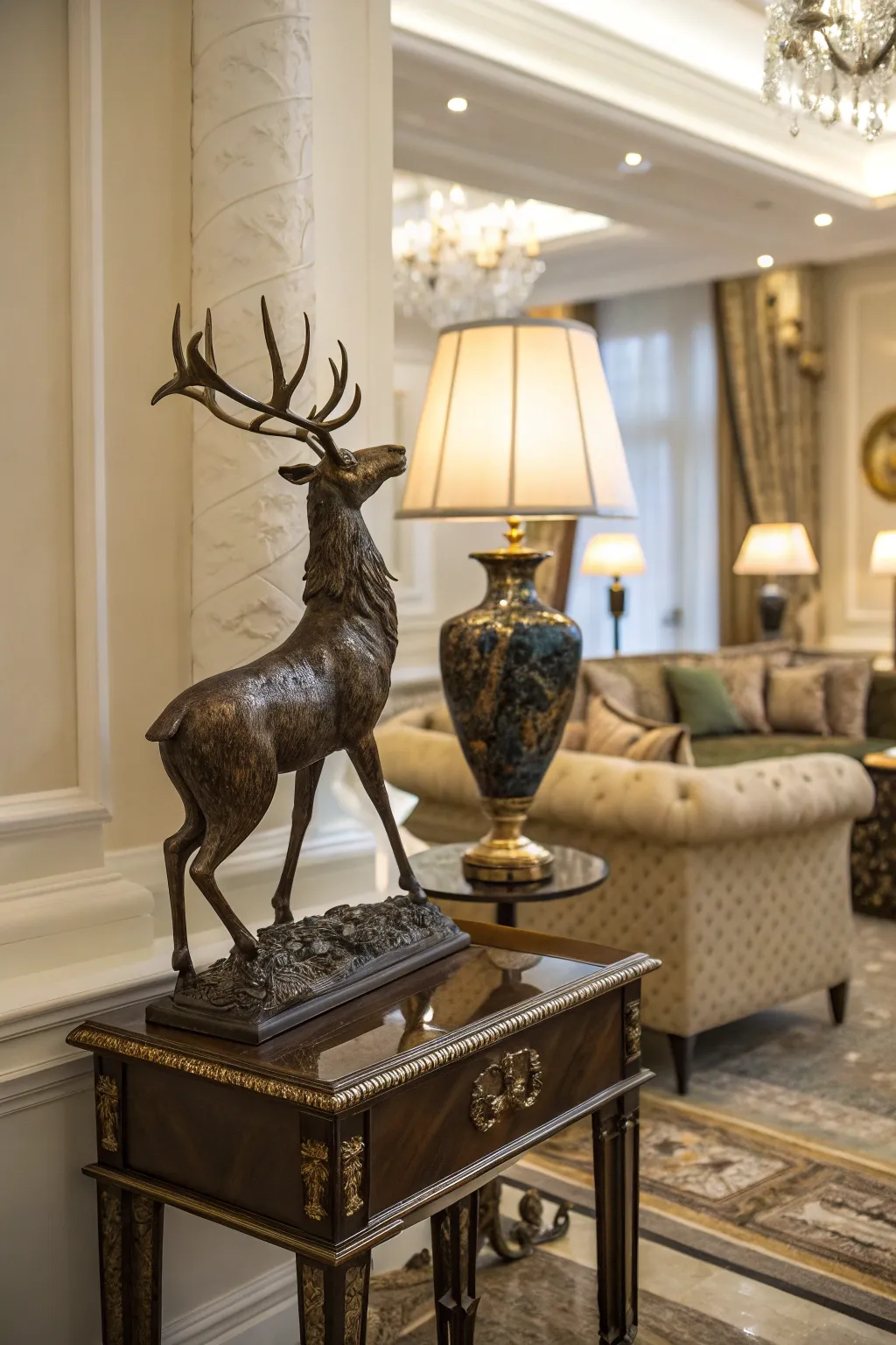 Incorporate wildlife carvings for a flicker of refinement and inventiveness. A finely made bronze stag carving introduces a spectacular highlight on my end table.