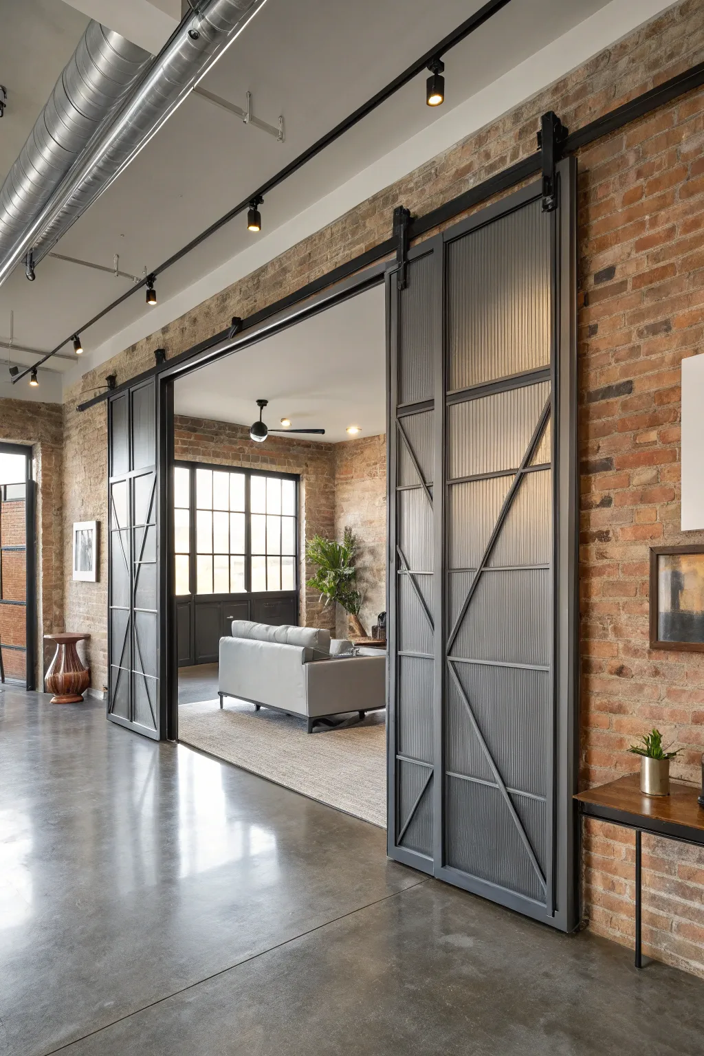 Industrial sliding doors bring an edgy style to this urban loft.